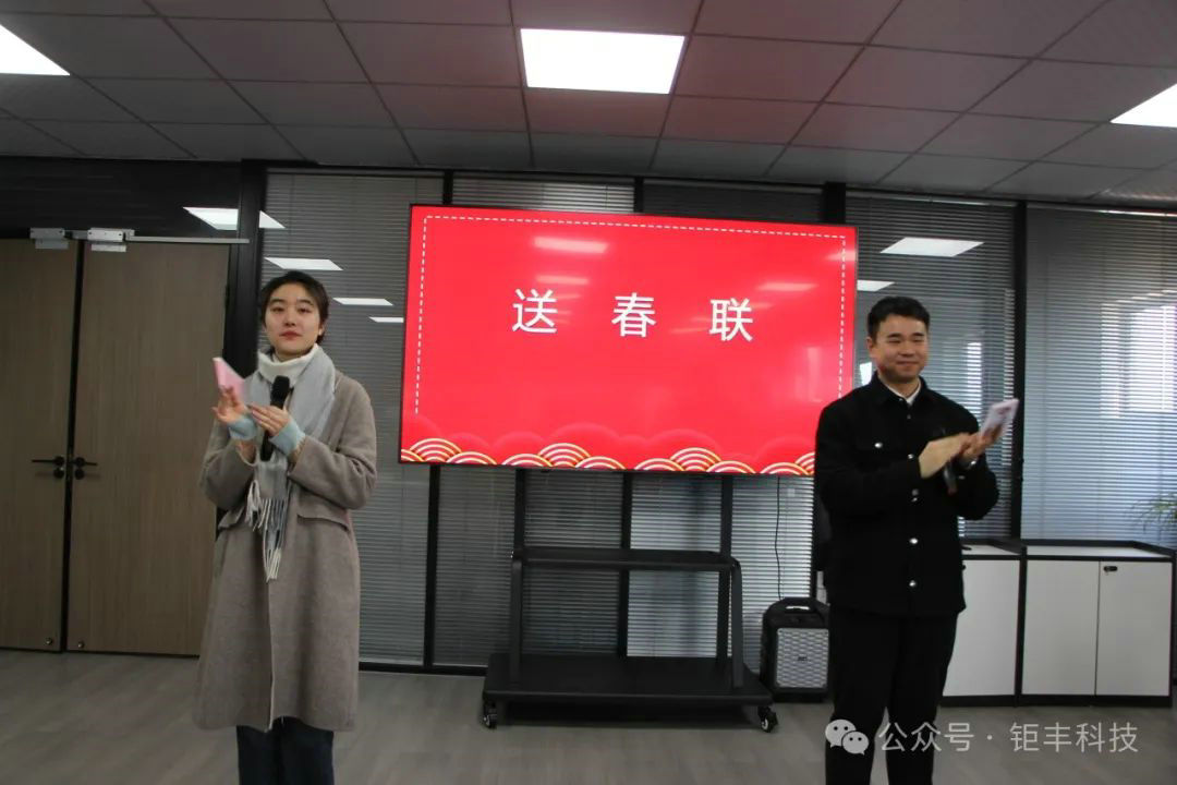 特别值得一提的是,会上还专门设置了别出心裁的送春联环节,总经理张晃清为各部门送上了专属春联,传递了公司对各部门的美好祝愿及新一年的期望。这一环节不仅增添了大会的文化氛围,更是展现了公司对团队精神的重视和弘扬。